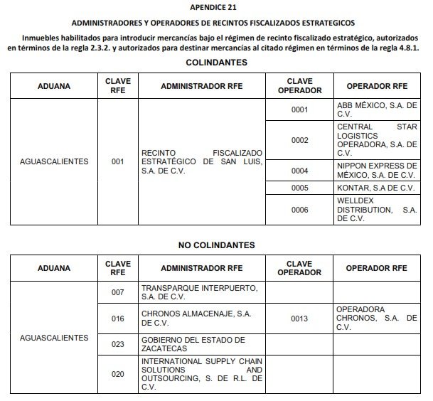 APÉNDICE 21 – ADMINISTRADORES Y OPERADORES DE RECINTOS FISCALIZADOS ESTRATÉGICOS
